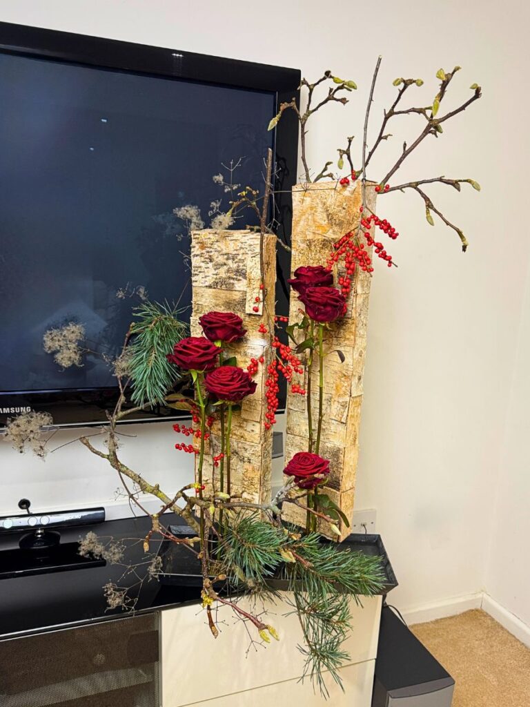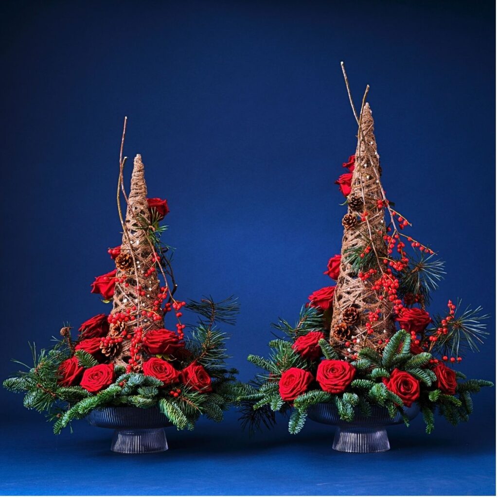 Per mantenere questi standard, ho costruito la struttura utilizzando rete metallica sagomata e fissata saldamente all’interno di una profonda ciotola di vetro, garantendo un eccellente supporto strutturale e un flusso d’acqua ottimale verso gli steli. Oltre alle loro credenziali di sostenibilità, queste rose offrono una longevità straordinaria, con una durata in vaso garantita fino a 14 giorni, assicurando che le mie composizioni natalizie rimangano fresche, vibranti e piacevoli per tutta la stagione festiva.