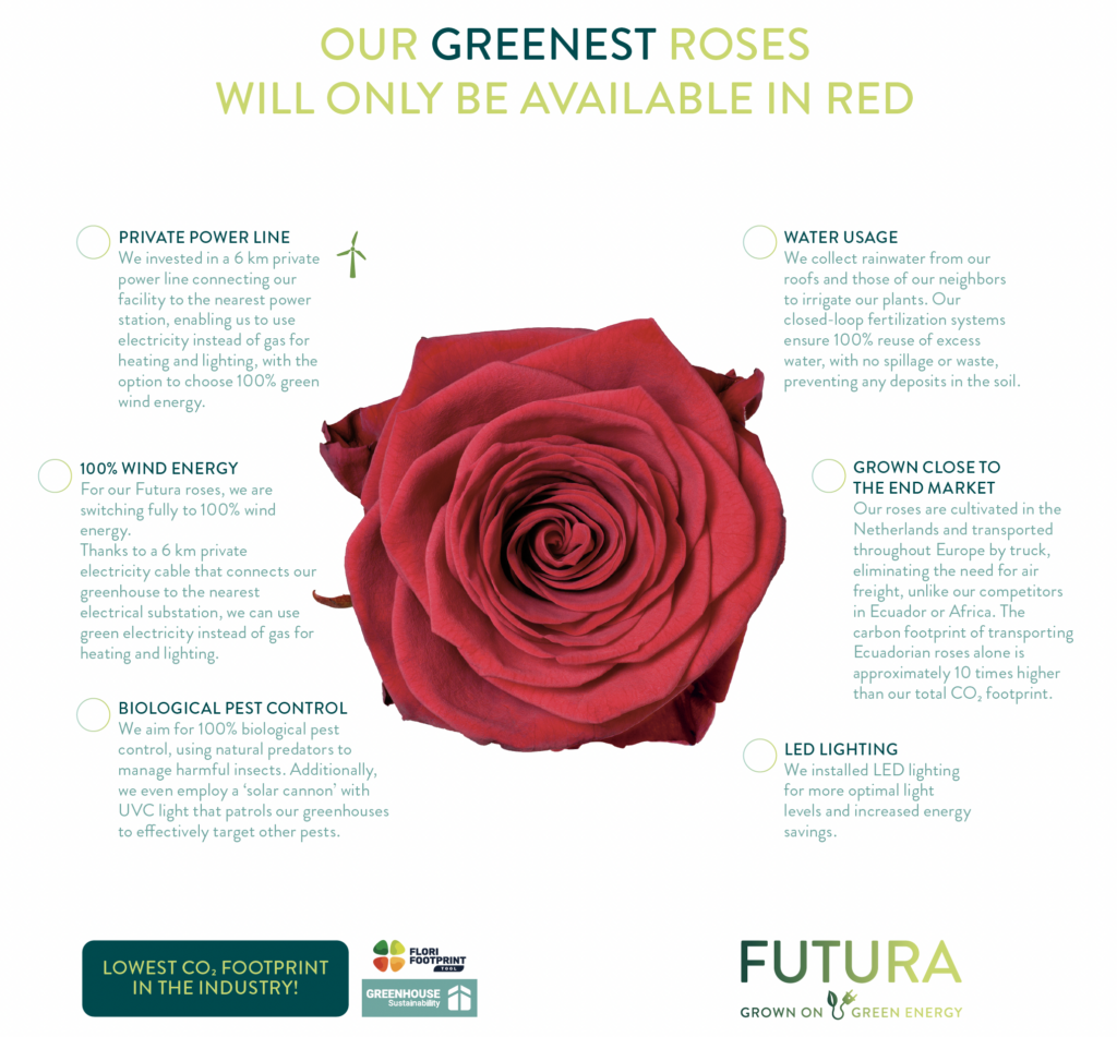 This is why we are offering all our roses under a FUTURA scenario. You can choose any of our sub-brands (Supra, Unica, Magna, Hollanda) as FUTURA. Every month, we will purchase the corresponding percentage of wind energy to sustainably grow these roses based on Futura orders. This process will be audited by an external company to ensure we uphold our claim to grow these roses with the lowest carbon footprint possible.