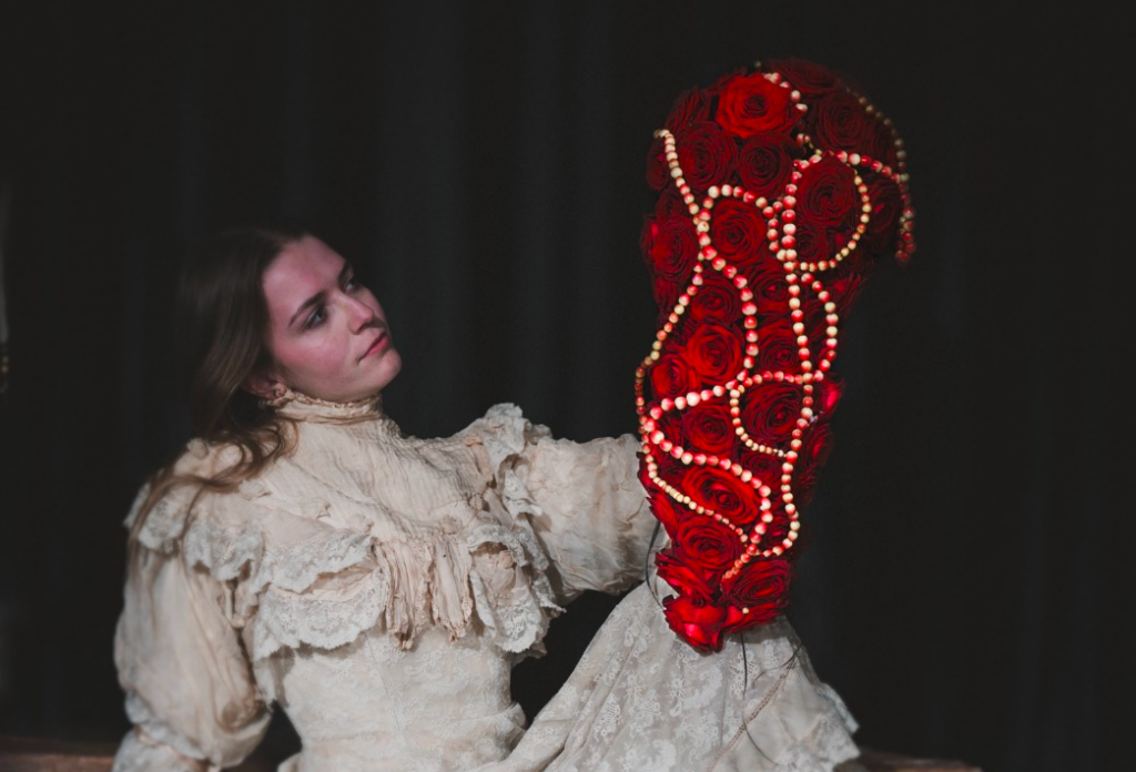 In deze setting contrasteert de kracht van de rode roos met de verfijning van een jurk uit 1900. Dit uitzonderlijke stuk, rijk aan kant en details, vertegenwoordigt een vrouwelijkheid uit een ander tijdperk, zowel bescheiden als verfijnd. Het werd genereus uitgeleend door het Modemuseum van de 18e en 19e eeuw in Orgelet, in de regio Jura. Deze waardevolle bijdrage creëert een dialoog tussen verleden en heden, tussen erfgoed en hedendaagse creatie.