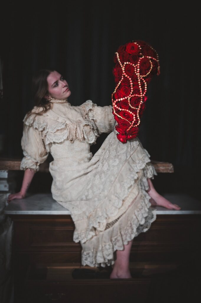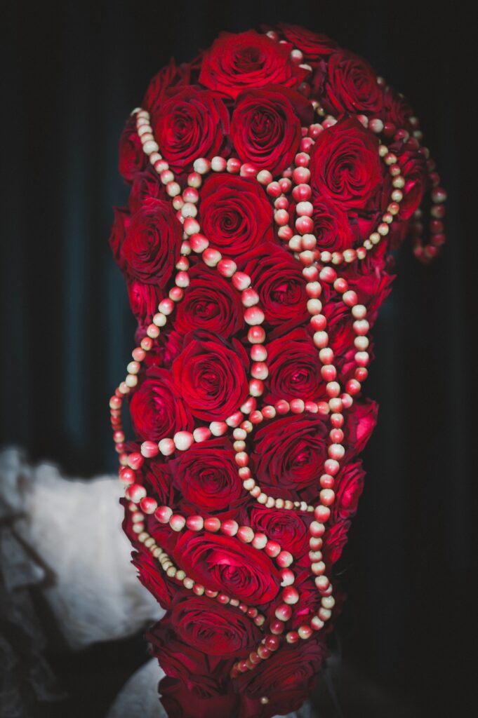 De zachte ivoortint van de jurk versterkt de intensiteit van de Red Naomi-rozen. Dit visuele contrast benadrukt de rijkdom aan texturen: de lichtheid van antieke stof tegenover de volle, bijna tastbare dichtheid van de bloemblaadjes. Het silhouet wordt een kader, terwijl de florale compositie fungeert als een verlengstuk van het lichaam, bijna als een tweede huid. Het resultaat is een esthetiek die zowel romantisch als licht dramatisch aanvoelt, waarin elk element zijn plaats vindt binnen een zorgvuldig uitgebalanceerde harmonie.